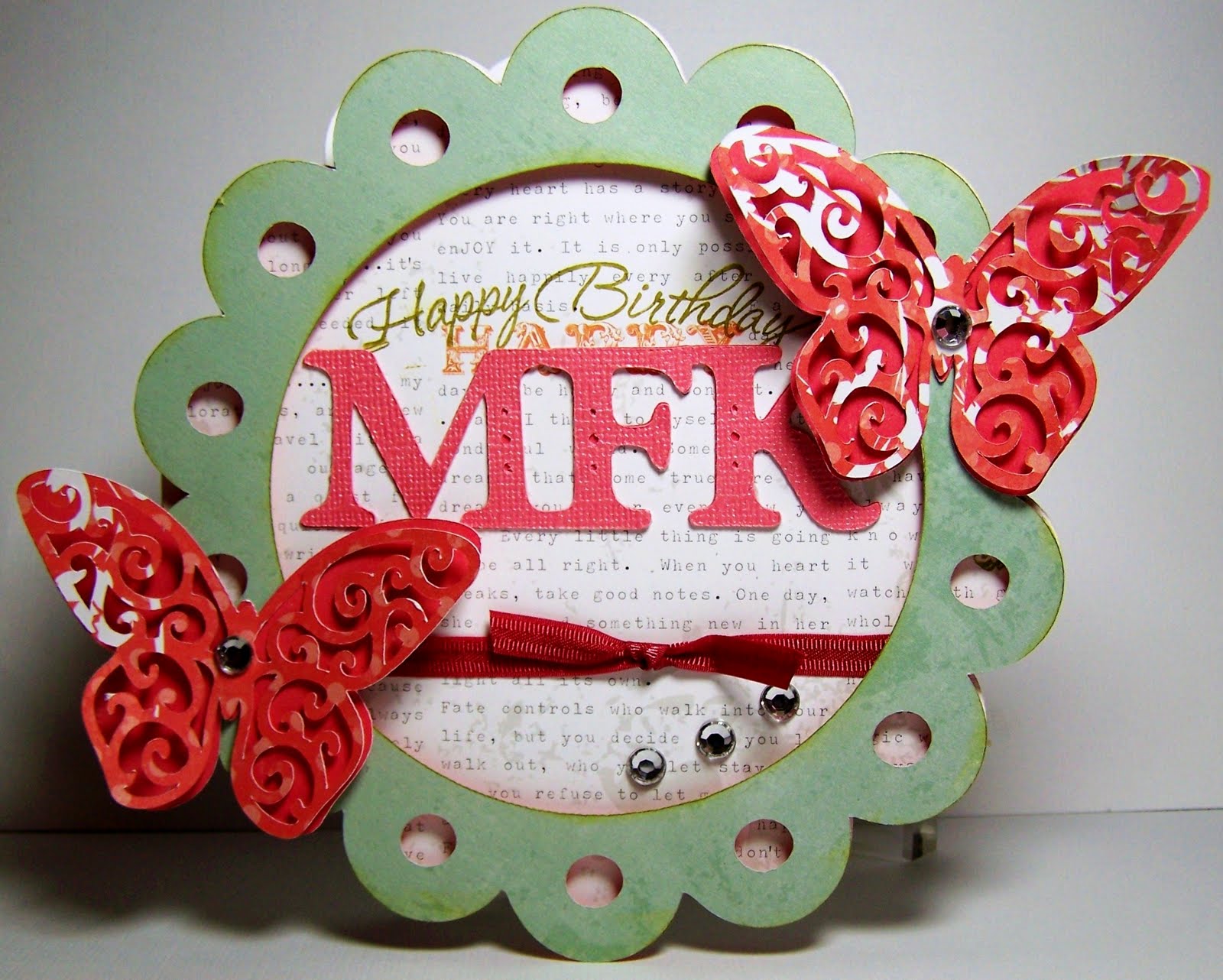 I added a ribbon and the same gems used on the butterflies to the front of the card. I also stamped the phrase, Happy Birthday to the front before adding the welded initials MFK.